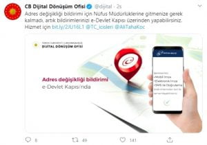 Dijital Dönüşüm Ofisi’nin Twitter hesabından yapılan açıklama,”Adres değişikliği bildirimi için Nüfus Müdürlüklerine gitmenize gerek kalmadı, artık bildirimlerinizi e-Devlet Kapısı üzerinden yapabilirsiniz” denildi.