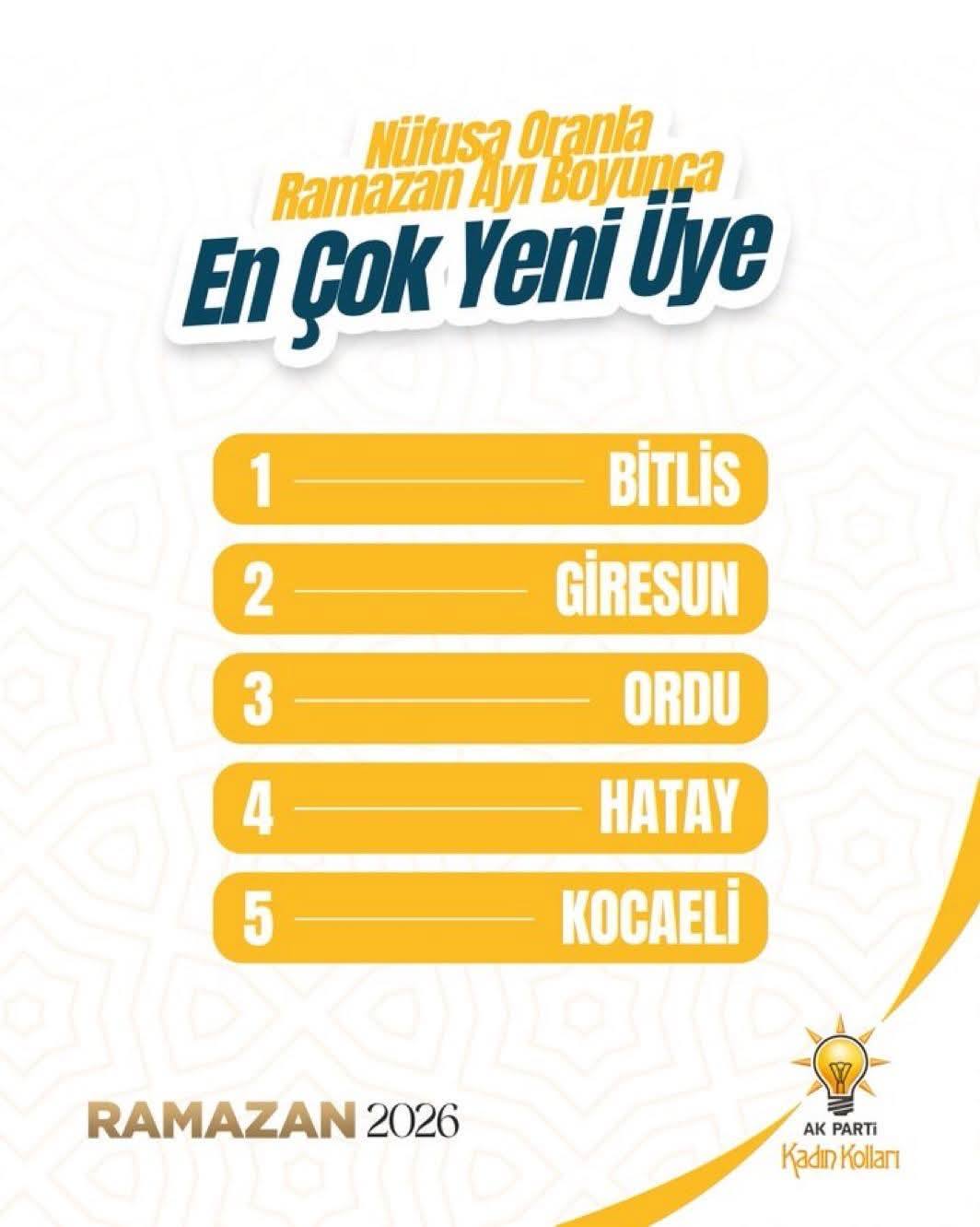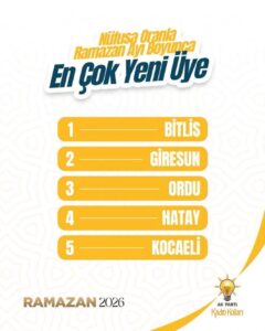 Nüfusa oranla Ramazan ayı boyunca en çok yeni üye kazanan iller sıralamasında Hatay 4. sırada yer aldı. Sıralama şöyle: 1. Bitlis, 2. Giresun, 3. Ordu, 4. Hatay ve 5. Kocaeli. Çalım, saha ziyaretleri, bilgilendirme toplantıları ve sosyal faaliyetlerle partinin tabanını güçlendirdi. Bu süreç, AK Parti Hatay Kadın Kolları’nın enerjisini yükseltirken, ekip çalışmasının ve liderliğinin ne kadar etkili olduğunu gözler önüne serdi.