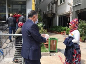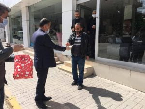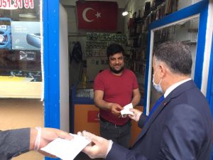 Belediye Başkanı Mehmet Hacıoğlu, İlçe Başkanı Mehmet Yumuşak ile beraber maskeleri cadde ve sokaklarda kendi elleri ile dağıttılar.