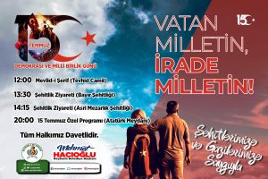 Reyhanlı Belediye Başkanı Mehmet Hacıoğlu, 15 Temmuz Demokrasi ve Milli Birlik Günü vesilesi ile mesaj yayımladı.