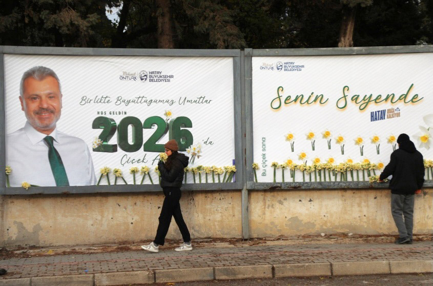 HBB ekipleri, şehrin faklı noktalarında bulunan billboardlarda HBB Başkanı Mehmet Öntürk’ün “Birlikte Büyüttüğümüz Umutlar 2026’da Çiçek Açıyor” yazılı tebrik mesajlarının olduğu görsellerin üzerine Hataylı vatandaşlara yılbaşı hediyesi olarak demet demet nergis çiçekleri yerleştirdi.