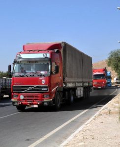 Reyhanlı ilçesinde bulunan Birleşmiş Milletlere ait lojistik depolarından yüklenen 45 TIR, Jandarma ve BM görevlilerinin eşliğinde geldiği Cilvegözü Gümrük Kapısı’ndan geçerek kente hareket etti.