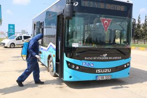 Reyhanlı’da hizmet veren toplu taşıma araçlarında sterilizasyon çalışmalarını sürdüren Büyükşehir ekipleri, yapılan çalışmaların tüm ilçelerdeki toplu taşıma araçlarında ve duraklarda yapılacağını ifade etti.