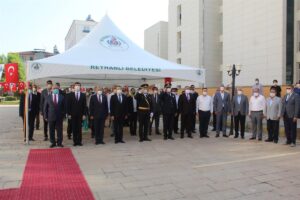 Cumhuriyet Bayramı Kutlamaları; 29.10.2020 Perşembe Günü saat 10.00’da Reyhanlı Hükümet Konağı Bahçesinde, protokol ve diğer katılımcıların iştirakiyle Saygı Duruşu ve İstiklal Marşı okunarak Şanlı Bayrağımızın göndere çekilmesiyle devam etti.