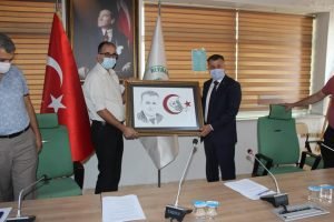 Suriyeli Hatat Faiz ALAHMAD tarafından başkan Mehmet Hacıoğlu’na hat sanatıyla işlenmiş başkanın portresini hediye etti.