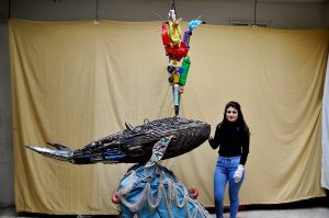 Lise öğrencisi Dilara Altınorak(19), denizden topladığı plastik ile hurdacılardan aldığı atıkları birleştirdi ve midesinde ortalama 40 kilo atıkla yaşayabilen balinanın heykelini yaptı. Yaklaşık 9 aydan bu yana hurda ve plastik sanatı ile ilgilendiğini anlatan Altınorak, “Atıklardan şimdiye kadar kartal ve kelebek heykelleri yaptım. Bunun yanında çeşitli resimlerde yaparak çalışmalarımı sürdürüyorum. 4 ay önce çevre kirliliği hakkında bir proje için çalışma başlattım. Bu çalışmam sırasından midesinde 40 kilo plastik atık saklayabilen bir balinanın yaşamına ilişkin bilgiler elde ettim. Çalışmaya başladım ve 4 ayda tamamladım. Cumhurbaşkanı Recep Tayyip Erdoğan’ın eşi Emine Erdoğan’ın yürüttüğü sıfır atık mavi projesini destekliyorum ve herkesi bu projeye destek vermeye çağırıyorum” dedi.