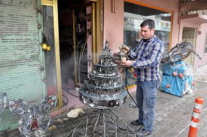 Kızı Dilara Altınorak hurda ve plastik kullanarak balina, babası Mervan ise hurda parçalarından 3 katlı pasta yaparak heykeller yapma çalışmalarına devam ediyor.