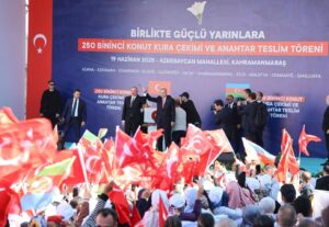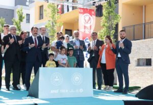 “Birlikte Güçlü Yarınlara” adıyla düzenlenen törende Cumhurbaşkanı Erdoğan Hatay’ın Defne İlçesi Hancağız Mahallesi TOKİ Afet Konutları Teslim Töreni’ne çevrim içi konferans yöntemiyle bağlandı.
