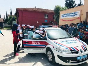 Reyhanlı’nın Tayfur Sökmen Mahallesi ilk ve ortaokuluna giden Jandarma Trafik Birimleri, ekipleri kullandıkları araç ve gereçleri tanıttı, ayrıca öncelik hayatın, öncelik yayanın projesini uygulamalı olarak anlattı.