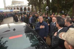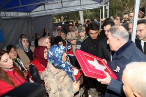 Henüz 26 yaşında ve bekar olan şehit uzman Onbaşı Beyazıt Bestami Buluş’un tabutunun sarılı olduğu al bayrağımız Milli Savunma Bakanı Hulusi Akar tarafından Şehidimizin askeri kamuflajını giyen anne Aynur Ertem’e sabır ve baş sağlığı temennileriyle teslim edildi.