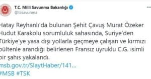 Sosyal medyadan yapılan açıklamada, “Hatay Reyhanlı’da bulunan Şehit Çavuş Murat Özeker Hudut Karakolu sorumluluk sahasında, Suriye’den Türkiye’ye yasa dışı yollarla geçmeye çalışan ve kırmızı bültenle arandığı belirlenen Fransız uyruklu C.G. isimli bir şahıs yakalandı” ifadelerine yer verildi.