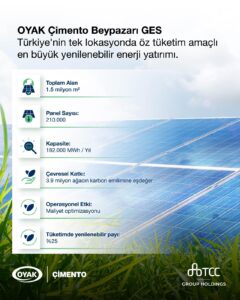 OYAK Çimento Ülke CEO’su Murat Sela ise konu hakkında şunları söyledi: “Operasyonel mükemmellik ve çevreye duyarlılık prensiplerimiz doğrultusunda, enerji verimliliğimizi en üst seviyeye taşıyacak yatırımlara odaklanıyoruz. Mardin’de başlayan güneş enerjisi yatırımlarımıza, tam kapasiteyle devreye aldığımız Beypazarı GES ile devam ediyoruz. Bu tesisimiz, hem teknik kapasitesi hem de öz tüketim odaklı yapısıyla Türk sanayisi için örnek teşkil eden bir proje. Yenilenebilir enerji alanındaki bu yatırımlarımızla yalnızca maliyetlerimizi optimize etmekle kalmıyor, ürün kalitemizi çevre dostu süreçlerle birleştirerek sektörümüze öncülük etmeyi sürdürüyoruz”.