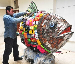 Reyhanlı ilçesinde, mozaik ve hurda sanatçısı Mervan Altınorak (50), denizden topladığı plastik ile hurdacılardan aldığı metal atıkları ile 200 kilo ağırlığında balık heykeli yaptı.