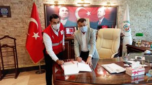 Belediyede gerçekleşen imza töreninde Başkan Mehmet Hacıoğlu ve Türk Kızılay Hatay Toplum Merkezi Yöneticisi Onur Karataş protokole imza attı.