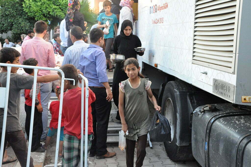 AK Parti Gençlik Kolları Genel Merkezi’nin Suriyeli sığınmacıların yoğunlukta yaşadığı yerlerde geçici aşevi olarak hizmet verecek olan TIR’ı, dün ilk olarak Hatay’ın Reyhanlı ilçesinde yemek dağıttı. Reyhanlı Belediye binası önünde konuşlanan TIR’dan iftar saatinde, Suriyeli sığınmacılar olmak üzere 2 bin 500 kişiye yemek verildi.