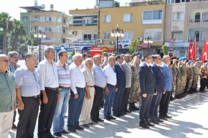 Belediye binası önünde, Kaymakam Fatih Çobanoğlu, Belediye Başkan Vekili Ahmet Kara’nın Atatürk Anıtı’na çelenk sunması ile başlayan törende, saygı duruşunda bulunuldu. Daha sonra İstiklal Marşı okundu.