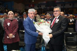 İl Müftüsü Hamdi Kavillioğlu’nun ardından konuşan Vali Doğan, “Mevlid-i Nebi Haftası münasebetiyle düzenlenmiş olan bu programın faydalı geçmesini temenni ediyorum. Alemlere rahmet olarak gönderilen bir peygamberin ümmeti olma şerefine nail olmaktan dolayı da mutlu olduğumu ifade etmek istiyorum. O peygamber ki daha peygamber olmadan önce müşriklerin Muhammedü’l-Emin dediği bir zat. Herkesin güvendiği, inandığı bir kişi. Emanetlerini Peygamber Efendimize emanet eden müşrikler döndüklerinde ise onu tam olarak alıyorlardı. Böyle bir peygamberin ümmeti olmak elbette ki önemli. Ecdadımız Peygamber sevgisini kelimelere sığdıramamıştır. Ecdat onu o kadar sevmiş ve özlemiş ki Muhammet’i Mehmetçik yapmış, gülü ise lale yapmıştır. Bütün emperyalist, kapitalist devletler ekonomik değer için tren yolu yaparken bizim ecdadımız Peygamberine ulaşabilmek için tren yolu yapmıştır. O rahatsız olmasın diye de rayları keçelerle döşeyerek, gül sularıyla yıkamıştır. Böyle bir ecdadın evlatları olmak bu millet için büyük bir onur vesilesidir. Bu yılki tema aile teması, birazdan hocamız bahsedecek onu zevkle dinleyeceğiz. Salonu hınca hınç dolduran hemşehrilerime de şükranlarımı sunmak istiyorum. Aile bu toplumun temel taşıdır. Eğer aileye sahip çıkamazsak devlete, millete, bu topraklara sahip çıkamayız. O yüzden aileye sımsıkı sarılmamız lazım. Aile bizim en kutsal değerimizdir. Oysa çağdaş dünyada hayatımıza giren sosyal medyayla, diğer iletişim araçlarıyla ilk etapta aileyi tahrip etmeye çalışmaktadırlar. O yüzden ailenin değerini bilip onu muhafaza etmemiz lazım. O yüzden çocuklarımızı çok iyi yetiştirip, dini ve milli değerleri, güzel hasletleri onlara öğretip geleceğe hazırlamamız lazım.” dedi.